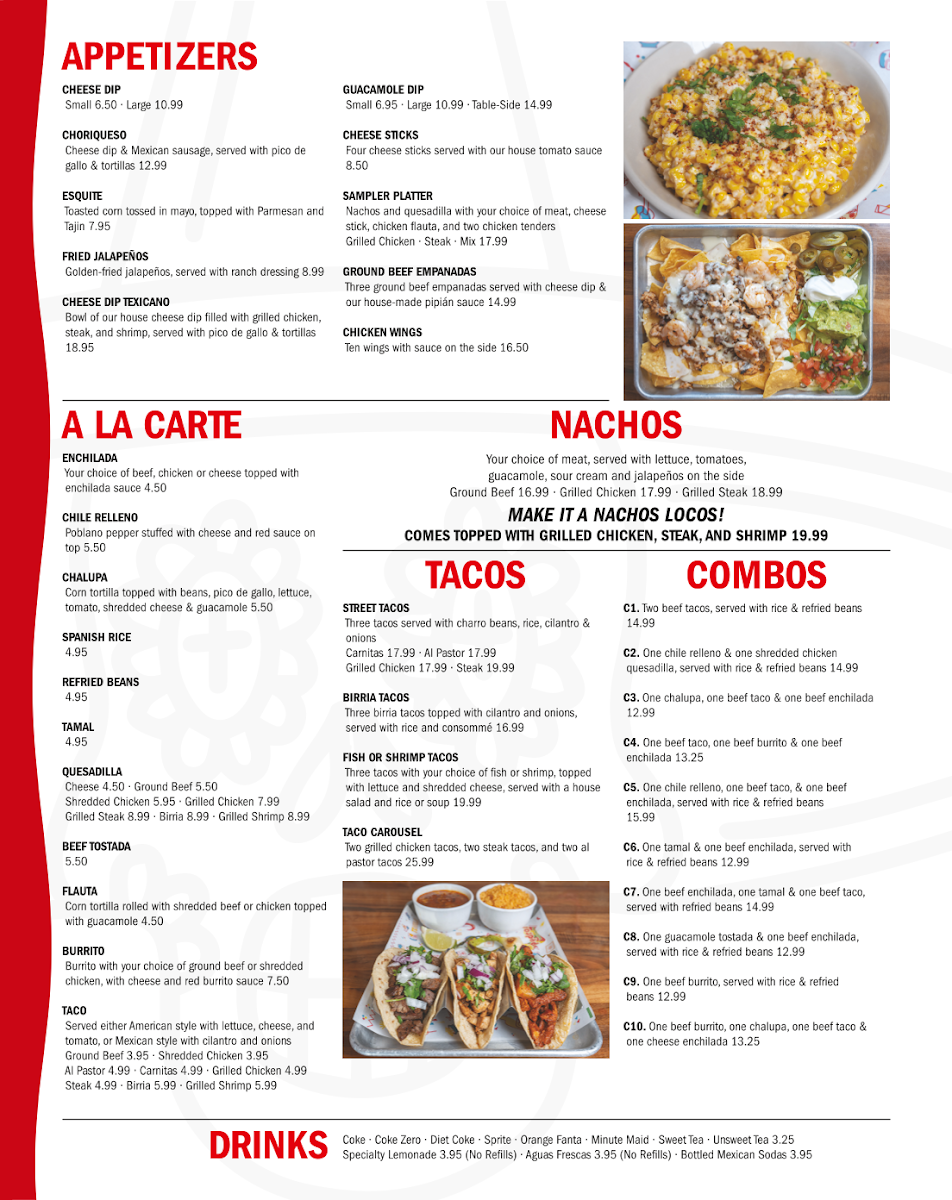 Grilled chicken, steak & shrimp served with lettuce, pico de gallo, guacamole, sour cream & charro beans, topped with cheese dip